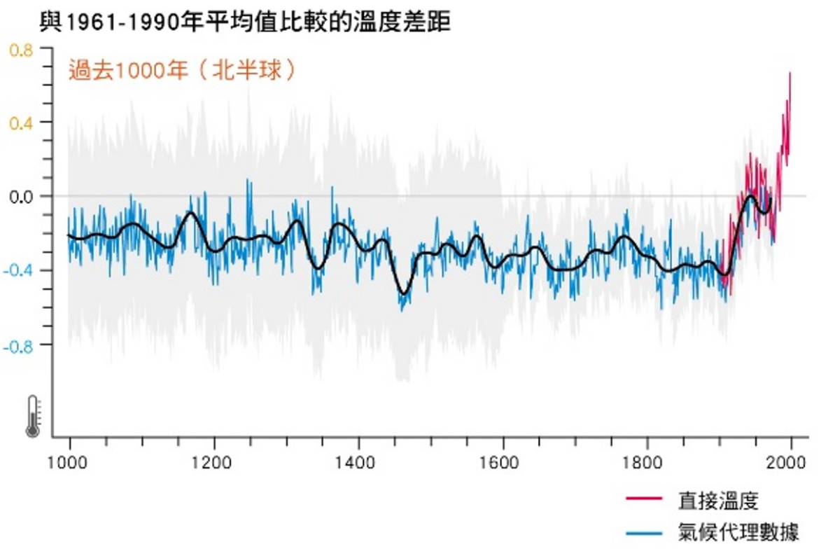 圖一、地球過去1,000年的溫度差距(改繪自:IPCC, Climate Change 2001: Synthesis Report, 2001)